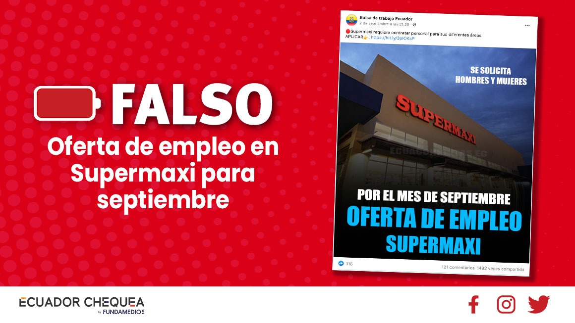 Circulan publicaciones de ofertas laborales falsas usando nuestra marca. Recuerde que Supermaxi no usa ninguna red social como bolsa de empleo. Cualquier comunicado lo encuentra en nuestros canales digitales oficiales o puntos de venta. #BastaDeNoticiasFalsas pic.twitter.com/4pJ4ToEt7M— Supermaxi Ecuador (@SupermaxiEcu) April 21, 2021