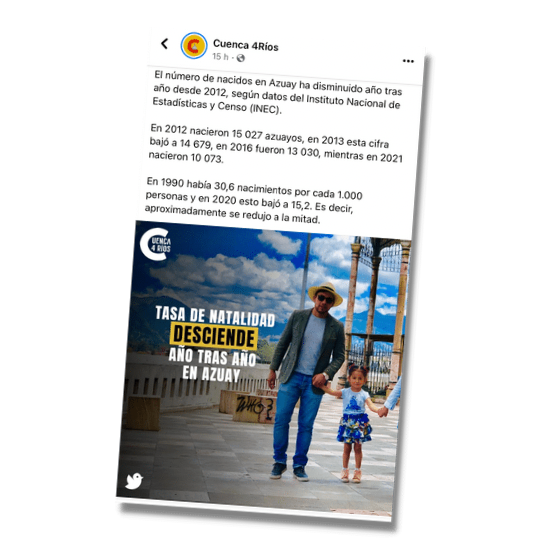En Facebook circula una publicación en la que se asegura que la tasa de natalidad y el número de nacimientos ha disminuido en Azuay durante los últimos años. Esta información es cierta.