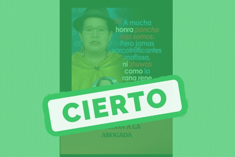 - Qué verificamos: Una publicación viral en TikTok que atribuye a Lourdes Tibán la frase “A mucha honra poncho rojo somos. Pero jamás narcotraficantes, mafiosa ni shuwas como la rana René”.