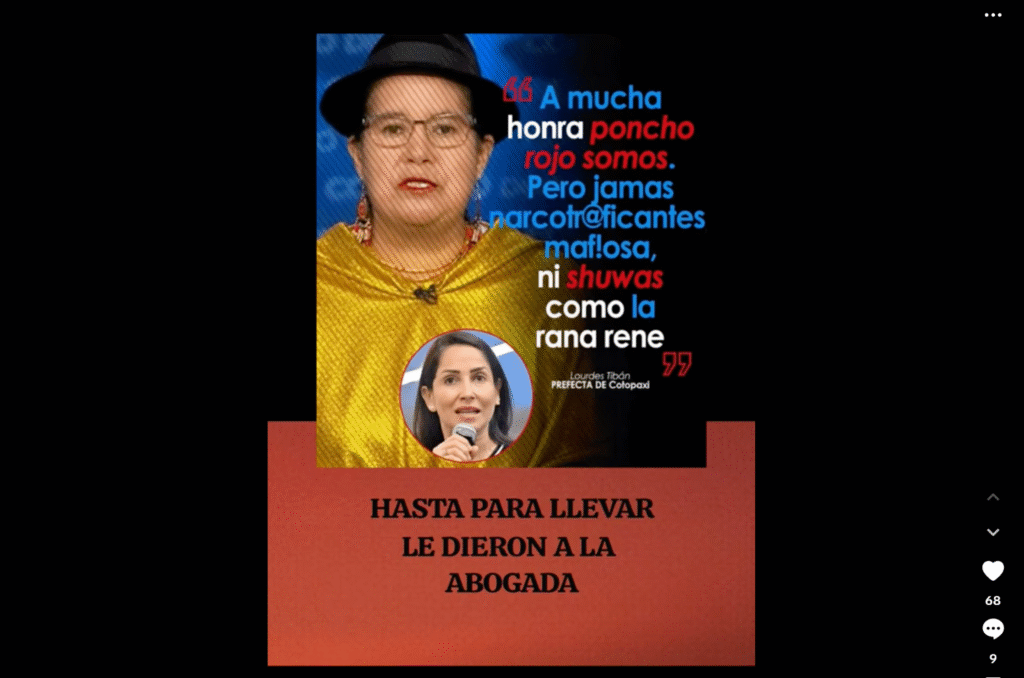 En TikTok circula un video que muestra una supuesta declaración de Lourdes Tibán en la que afirma: “A mucha honra poncho rojo somos. Pero jamás narcotraficantes, mafiosa ni shuwas como la rana René”. El clip fue compartido por una cuenta de la red social y replicado por varias páginas que añadieron comentarios de tono político.