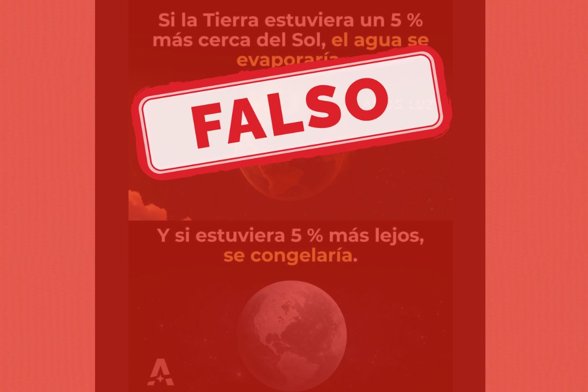 En redes sociales circula una imagen que afirma que si la Tierra estuviera un 5 % más cerca del Sol, el agua se evaporaría, y si estuviera 5 % más lejos, se congelaría. Ecuador Chequea revisó la evidencia científica y comprobó que la afirmación es falsa. Un cambio de esa magnitud sí alteraría el clima global, pero no bastaría para evaporar los océanos ni congelar el planeta, que seguiría dentro de la zona habitable del Sistema Solar.