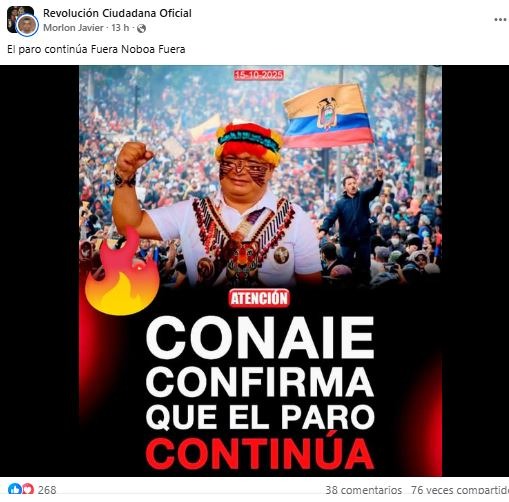 Una publicación en Facebook afirma que la Confederación de Nacionalidades Indígenas del Ecuador (Conaie) confirmó la continuidad del paro. La versión coincide con el comunicado de la organización: “reorganizar la resistencia en todo el país” y asumir como objetivo común la campaña por el NO en la consulta y el referéndum, resuelto en el Consejo Ampliado del 14 de octubre.