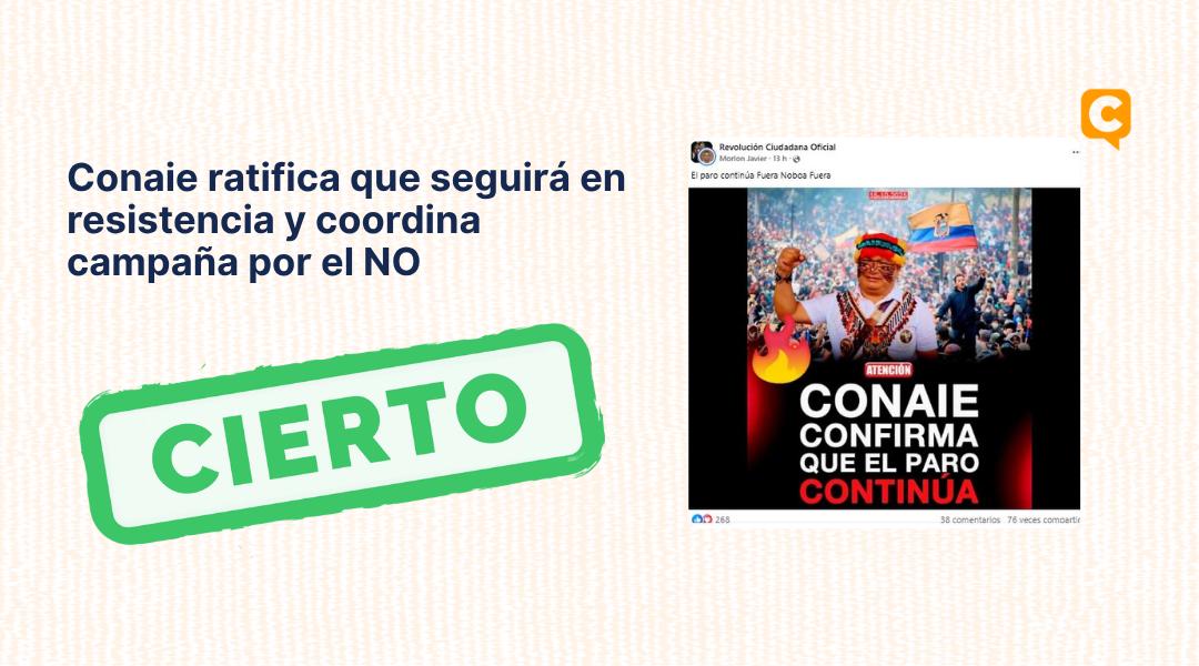 Una publicación en Facebook afirma que la Confederación de Nacionalidades Indígenas del Ecuador (Conaie) confirmó la continuidad del paro. La versión coincide con el comunicado de la organización: “reorganizar la resistencia en todo el país” y asumir como objetivo común la campaña por el NO en la consulta y el referéndum, resuelto en el Consejo Ampliado del 14 de octubre.