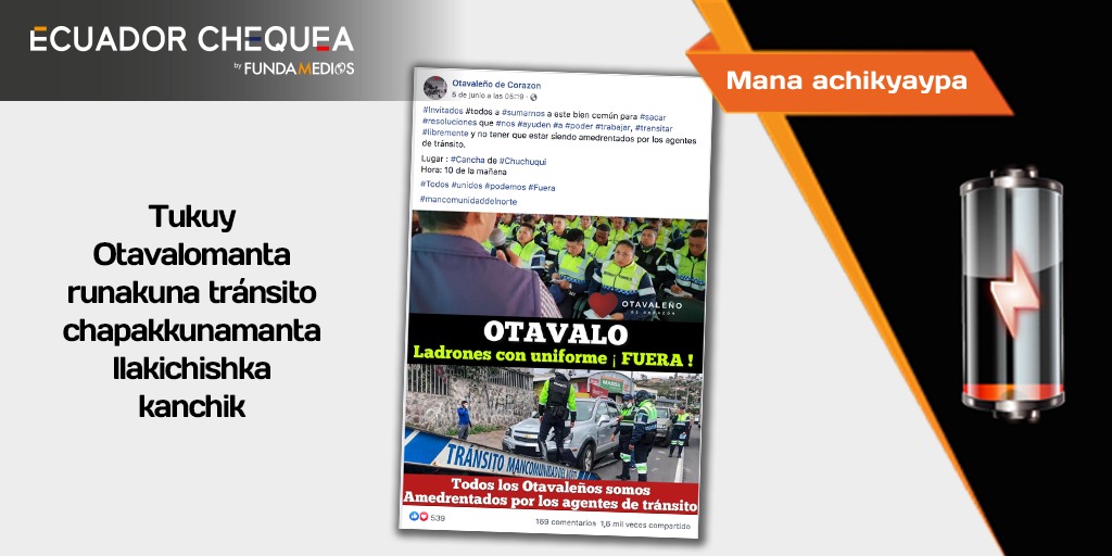 5 raymi killapimi, Facebook pankapi Otavaleño de Corazónpi wakin rikchakunata Tránsito chapakkunamanta, Otavalo kitipa, Imababura markamanta yallichinakun, chaypimi nin “tukuy Otavalo runakunamanmi tránsito chapakkuna llakichinakun”. Mana achikyaypa kanchu.