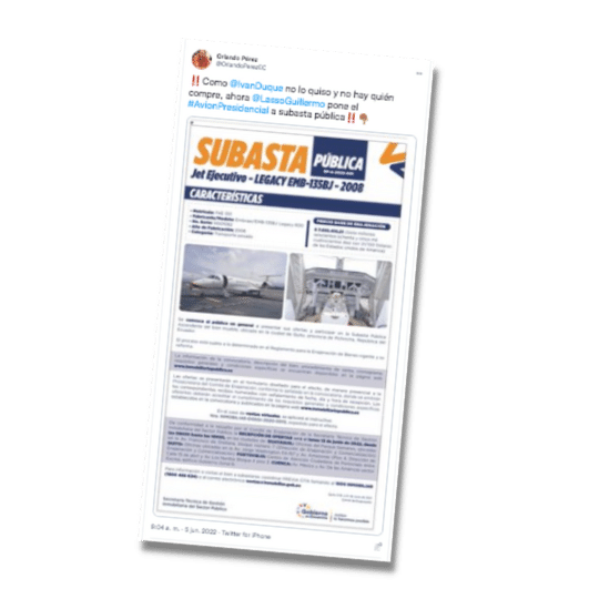 La venta del avión presidencial Legacy ha sido objeto de escándalos. El presidente, Guillermo Lasso, anunció que este se vendería a la Fuerza Aérea de Colombia. Sin embargo, las autoridades del país vecino lo desmintieron. Con esta información, un usuario de Twitter publicó que, ya que Iván Duque, presidente de Colombia, no quiso el avión, ahora Lasso lo puso en subasta pública. La información es engañosa. La subasta de la aeronave se anunció en febrero del 2022 y no es un acto vinculado directamente con las declaraciones de Duque.