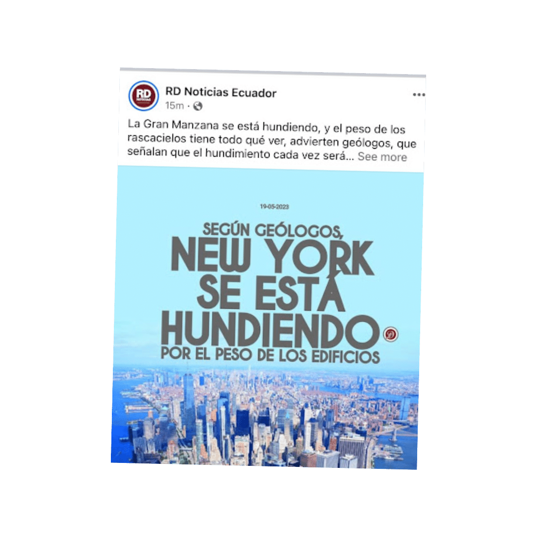Una publicación en la red social Facebook asegura que, según geólogos, Nueva York se está hundiendo. Calificamos este contenido como impreciso. El hecho parte de un estudio publicado por la Unión Geofísica Americana que determinó que Nueva York se está hundiendo entre uno y dos milímetros cada año, debido al peso que los edificios ejercen sobre el suelo de la urbe, pero también pueden influir otros factores, como los huracanes y el aumento de la urbanización de ese país.