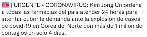 Desde 2020, se registraron casos masivos en los contagios de Covid-19 a nivel mundial. Sin embargo, a finales de 2021 y principios de 2022, el mundo experimentó nuevamente una ola de contagios a causa de la variante Ómicron, pero actualmente se ha registrado un brote explosivo de contagios en Corea del Norte. Una publicación en Twitter asegura que Corea del Norte registra más de 1 millón de contagios y que Kim Jong Un ordena a todas las farmacias de ese país atender 24 horas para intentar cubrir la demanda ante el brote de casos. La información es cierta.