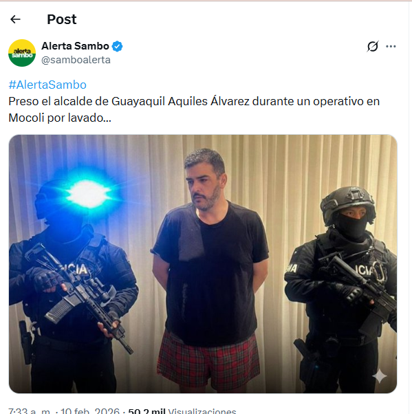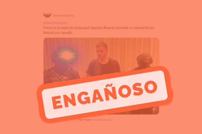 Un post difundido en la red social X asegura que el alcalde de Guayaquil, Aquiles Álvarez, fue detenido y que la imagen que acompaña la publicación lo muestra con short y camiseta negra, sin grillete electrónico, durante el procedimiento policial.