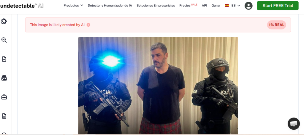 Sin embargo, una imagen que circula en redes sociales, donde supuestamente se lo observa detenido con short y camiseta negra, no corresponde a un registro real del procedimiento y presenta claras señales de haber sido generada con inteligencia artificial.