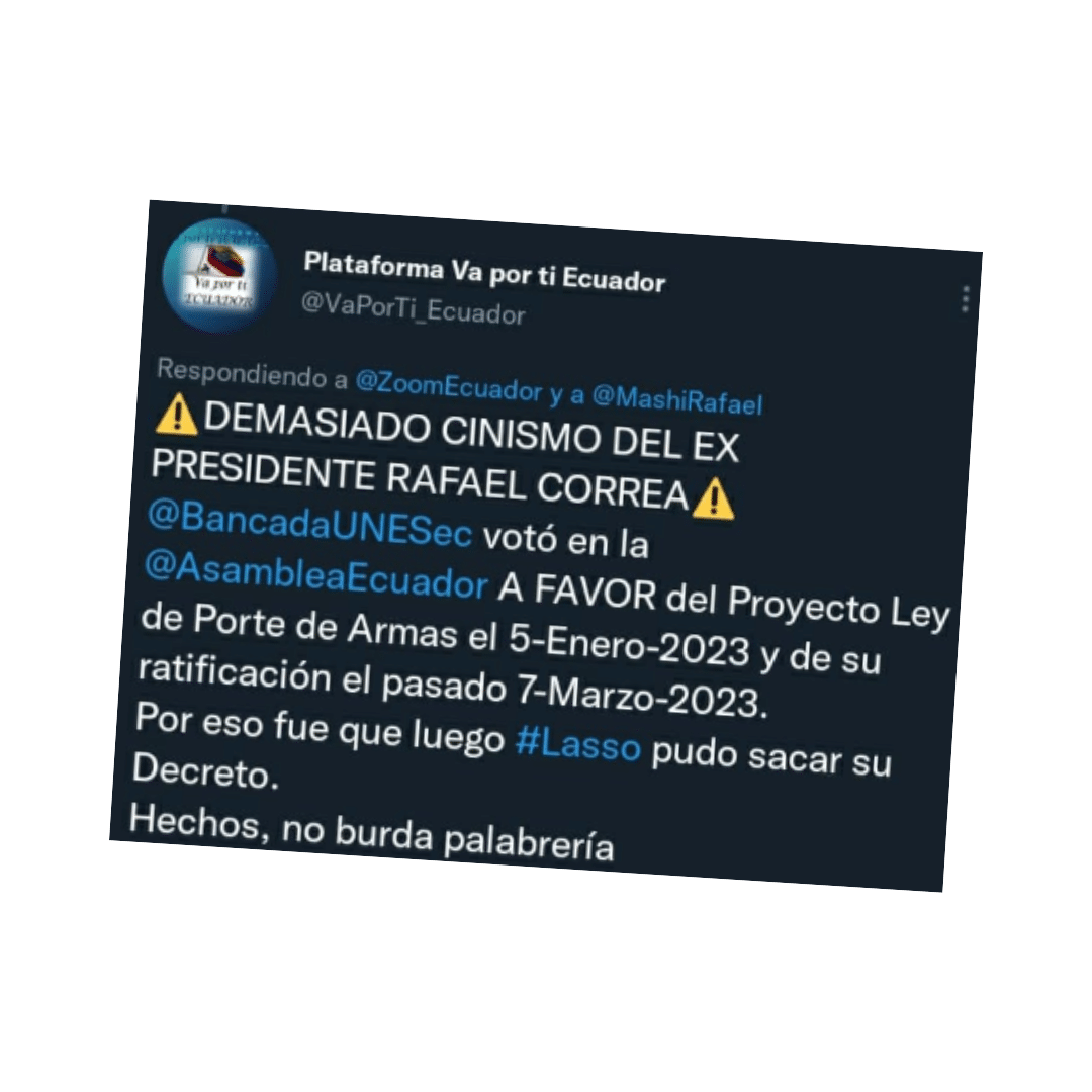 En una publicación de Facebook se asegura que la bancada correísta (UNES) de la Asamblea votó a favor de un supuesto ‘Proyecto de Ley de porte de Armas’ en enero de este año. Esta información es engañosa. El proyecto de ley que apoyó UNES a inicios de año fue el de la Ley Orgánica Reformatoria a Varios Cuerpos Legales para el Fortalecimiento de las Capacidades Institucionales y la Seguridad Integral. En dicho proyecto, si bien se reformaron artículos relacionados con el porte de armas, no se autoriza la tenencia, como lo hizo el Ejecutivo a inicios de abril.