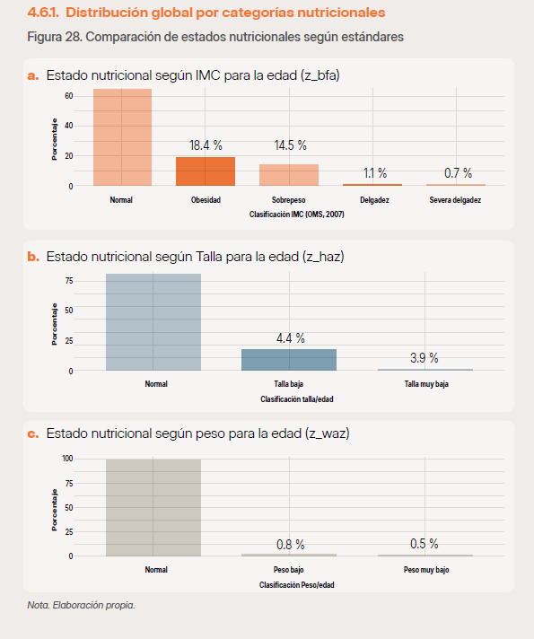 El estudio, basado en una muestra de 600 niños y niñas, señala que el 65,3% está en rango normal de Índice de Masa Corporal, IMC, pero advierte que el peso del problema está en los extremos. “Estas cifras reflejan una creciente carga de exceso de peso en la infancia”, dice el informe.