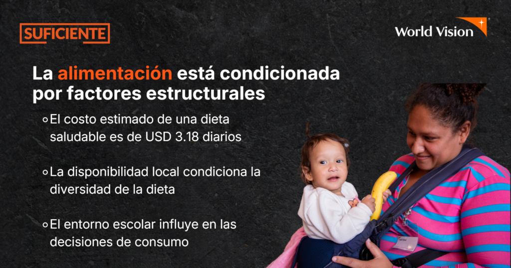 El informe también señala que una dieta saludable cuesta al menos 3,18 dólares por día por persona. Sin embargo, ese umbral resulta inalcanzable para gran parte de la población estudiada. “Yo diría que la mayoría” de los hogares analizados no cubre ese costo, afirmó Lasso, al señalar que el estudio se centró en grupos vulnerables afectados por pobreza, exclusión y desigualdad.