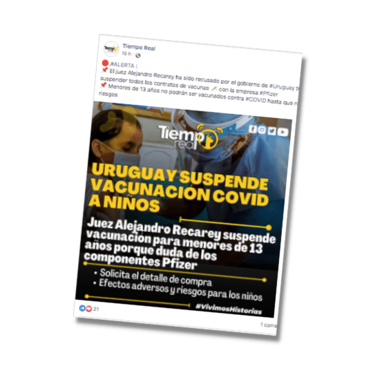 En Facebook se publicó un contenido que asegura que Uruguay suspendió el proceso de vacunación contra el Covid-19 en niños. Además, señala que el juez Alejandro Recarey suspendió la inmunización para menores de 13 años, porque duda de los componentes de la vacuna de Pfizer. La información es cierta.