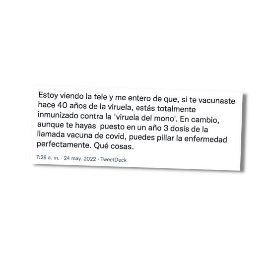 Un contenido en Twitter asegura que si una persona se vacunó hace 40 años contra la viruela está totalmente inmunizado contra la viruela del mono. Sin embargo, si se vacunaron con las tres dosis de la vacuna contra el Covid-19 aún se puede contraer la enfermedad. La información es falsa.