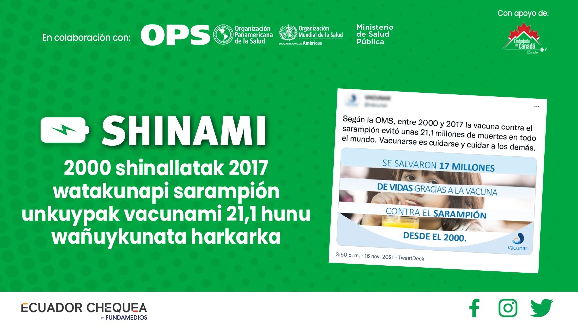 Twiiter pankapi shuk willayta yallichinakurka, OMS tantanakuyka, 2000 shinallatak 2017 watakunapi sarampión unkuypak vacunami kay unkuywan ama wañuykuna tiyachun 21,1 hunuman yanapashka. OMS pankapi rikurin 80% urayman rishkata, 2000 watapi 545.000 shinallatak 2017 watapika 110.000.