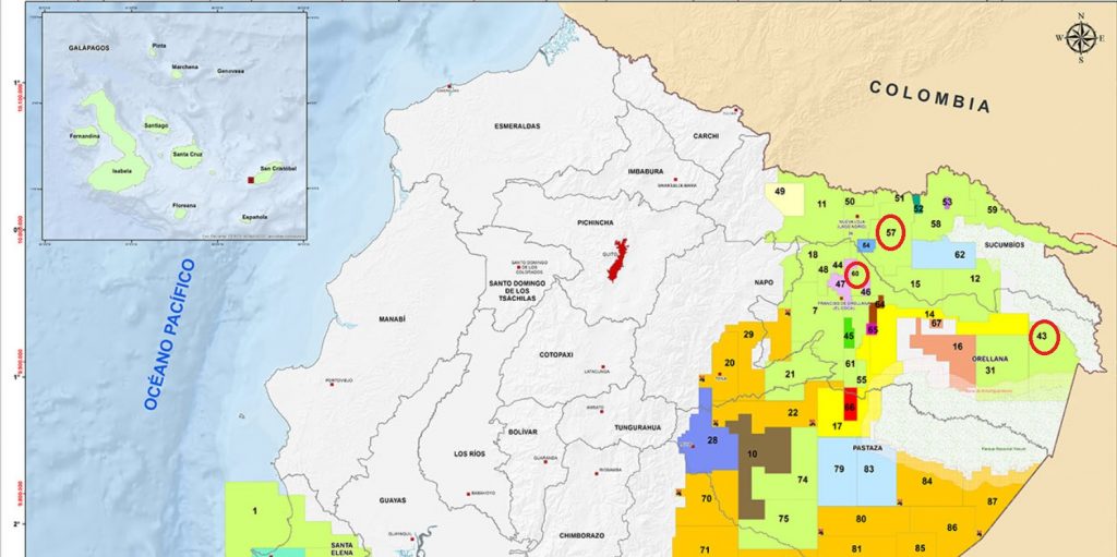 En círculos rojos señalados los tres bloques petroleros que más producen en Ecuador
