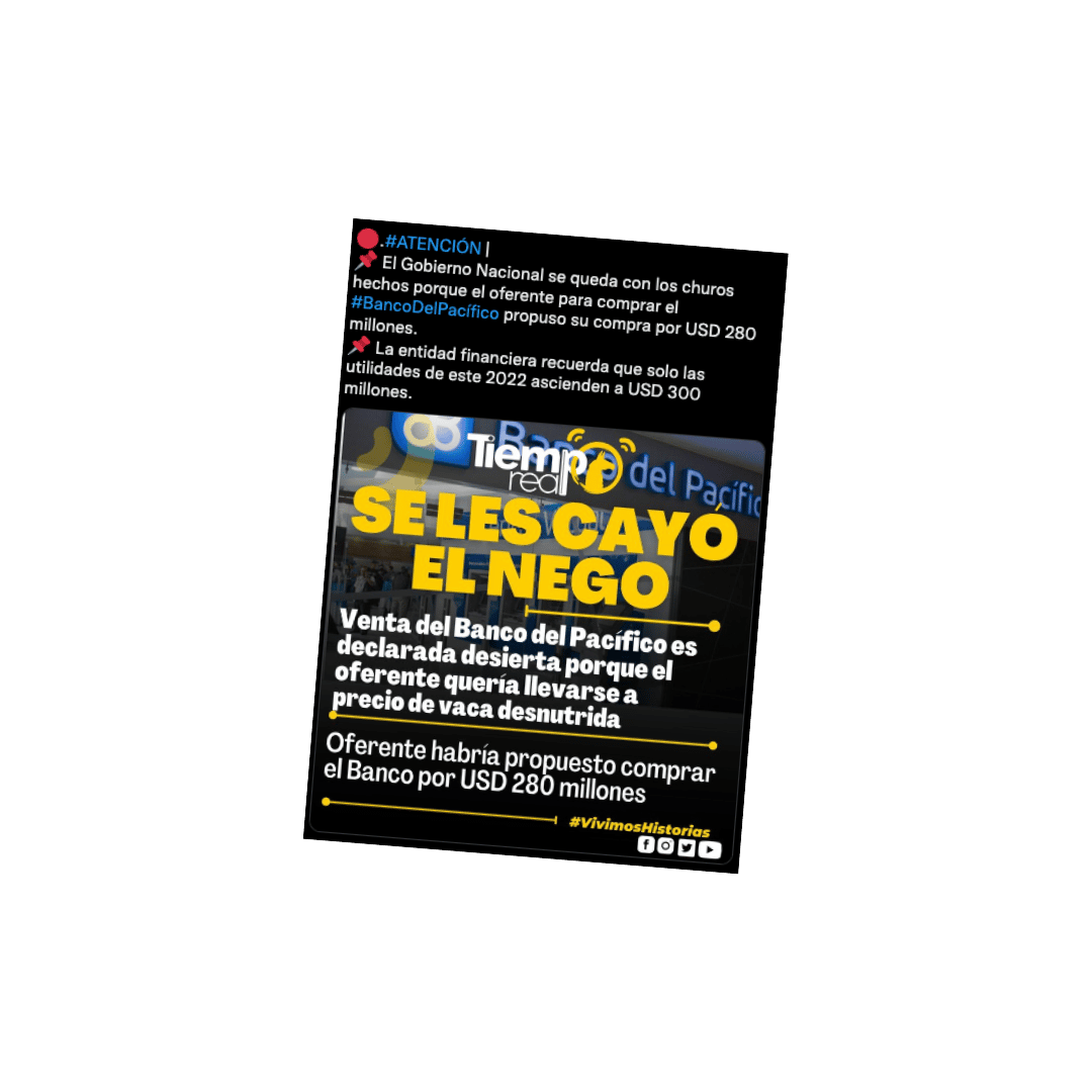 El 10 de noviembre pasado, el Banco del Pacífico dio a conocer, a través de un comunicado en la red social Twitter, que el proceso de venta fue declarado desierto luego de que se cumpliera con el cronograma previsto.