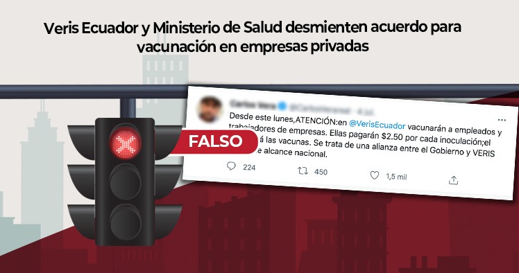 En ese sentido, circuló desde el 4 de julio, en cuentas de Twitter personales y de reconocidos periodistas, que la empresa Veris vacunaría a sus empleados, y además, participaria en la coordinación en el proceso de vacunación de las empresas privadas en Ecuador. La información fue desmentida por la empresa y por el Ministerio de Salud.