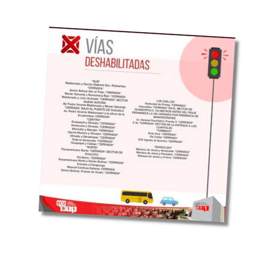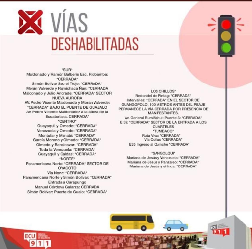 20 de las 49 vías afectadas por las protestas de este día se encuentran completamente cerradas. En su mayoría esto se debe a la movilización convocada por la Conaie. En redes y por mensajería instantánea se compartió una imagen, supuestamente del ECU 911, donde se encontraban las vías deshabilitadas en todo Pichincha. La información es falsa. El ECU 911 desmintió la imagen.