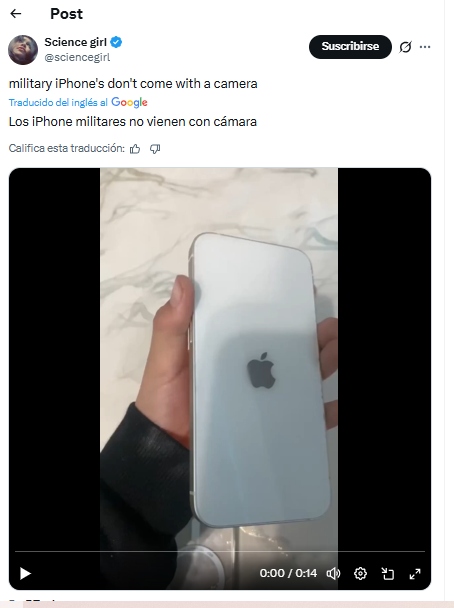 En X, circula un video de la cuenta Science girl en el que se muestra un iPhone sin módulo de cámara y se afirma que “los iPhone militares no vienen con cámara”.