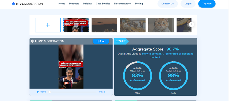 - Herramienta de análisis de IA Hivemoderation, puntuación de probabilidad de contenido manipulado.