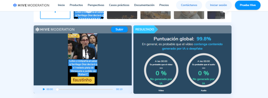 Además, el equipo sometió el clip a la herramienta Hive Moderation, especializada en detección de contenido generado o manipulado con inteligencia artificial.