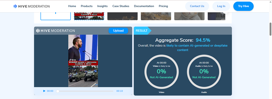 – Herramienta Hive Moderation (puntaje de manipulación: 94,5%).