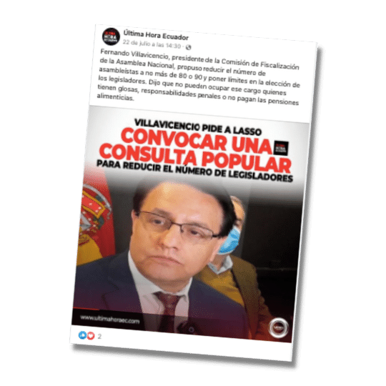 En Facebook circula una publicación en la que se asegura que Fernando Villavicencio, asambleísta independiente y presidente de la Comisión de Fiscalización de la Asamblea Nacional, habría pedido al presidente de la república, Guillermo Lasso, que convoque a una consulta popular para reducir el número de legisladores. Esta información es cierta.