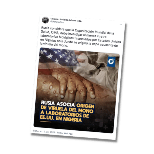 En Twitter se publicó un contenido que asegura que se debe investigar a los laboratorios biológicos financiados por Estados Unidos en Nigeria, ya que ha sido el país donde se originó la cepa causante de la viruela del mono y la causa podría estar en esos laboratorios. La información es falsa.