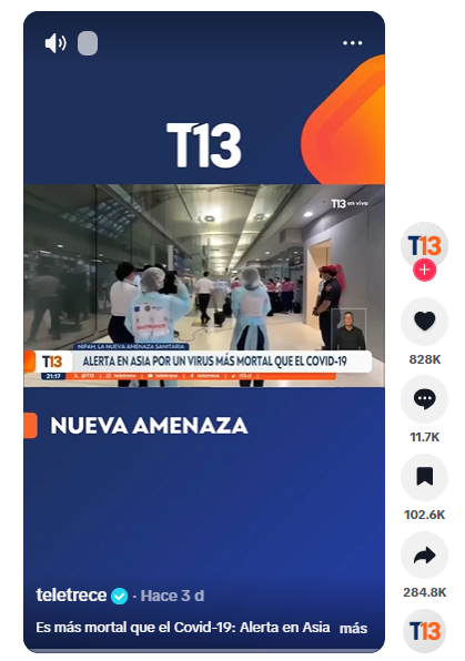 En TikTok circula un video con el texto: “Alerta en Asia por el virus Nipah: Más mortal que Covid-19”. También se afirma que Nipah es “más peligroso”. En TikTok, en un post atribuido a tele13 / T13.