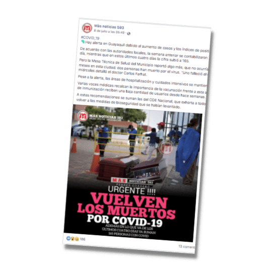 Una publicación en Facebook menciona que vuelven los muertos a causa del Covid-19. Además, señala que en los últimos cuatro días suman 165 personas con el virus. En la descripción se menciona que existe alerta en Guayaquil debido al aumento de casos y que la Mesa Técnica de Salud del Municipio reportó que dos personas han muerto por el virus. Calificamos esta información como engañosa, porque, si bien en Guayaquil se registraron dos fallecimientos a causa del virus, la cifra no ha aumentado exponencialmente.