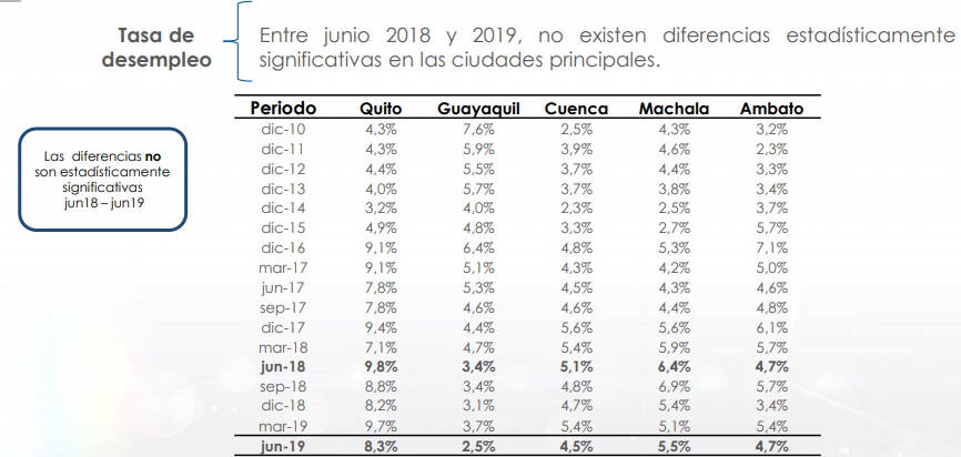 Pese a que el representante capitalino afirme que su ciudad nunca antes registró los índices de desempleo más elevados en el país, los datos oficiales cifran otra realidad. De acuerdo al Instituto Ecuatoriano de Estadísticas y Censos, Quito es la ciudad con el índice más elevado de desempleo desde diciembre de 2016, es decir hace casi tres años.